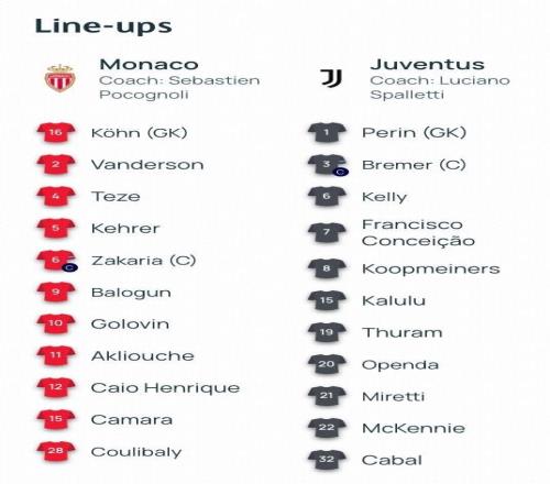 北京时间1月29日04:00,欧冠联赛阶段的一场对决。摩纳哥坐镇主场,迎战尤文图斯。赛前,双方的阵容公布如下: