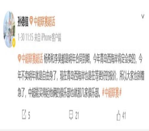 孙德信在社媒上表示:杨希和李昊都是明年合同到期,今年青岛西海岸肯定会卖的!今年不卖明年就是自由身了,现在青岛西海岸也是在等更好的报价,所以大家也别着急了,中超能买得起他俩的俱乐部也就那几家俱乐部。
