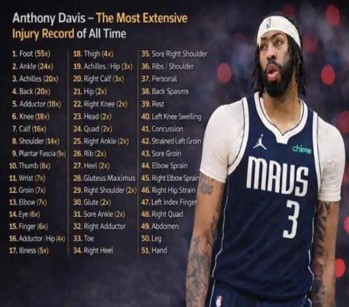 事实上,伤病一直是都是浓眉职业生涯挥之不去的阴影。这位32岁球星的伤病史足以列出一份长长的名单。从早期的肩部、膝盖问题到近年的脚踝、腹股沟和手部伤病,累计至少遭遇285次伤病,可谓是触目惊心。