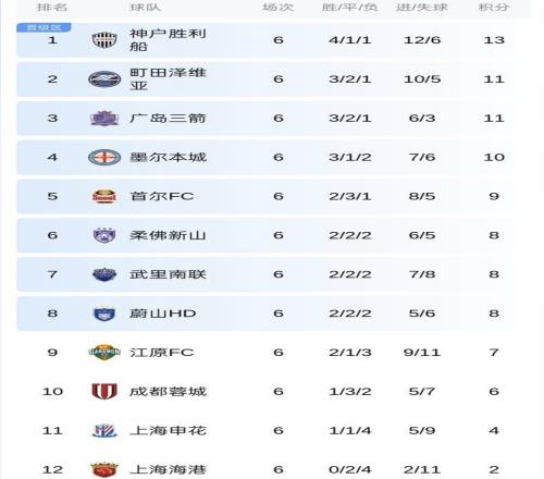 亚冠精英赛东西亚分区,每个分区12支球队参赛,前8名晋级淘汰赛。在目前的亚冠东亚积分榜上,神户胜利船13分,町田泽维亚11分,广岛三箭11分,日职联3支球队包揽前3名。墨尔本城10分第4,首尔9分第5,柔佛新山、武里南联以及蔚山HD同为8分,排名第6-8位。而江原7分,蓉城6分,申花4分,海港2分,排名第9-12位。