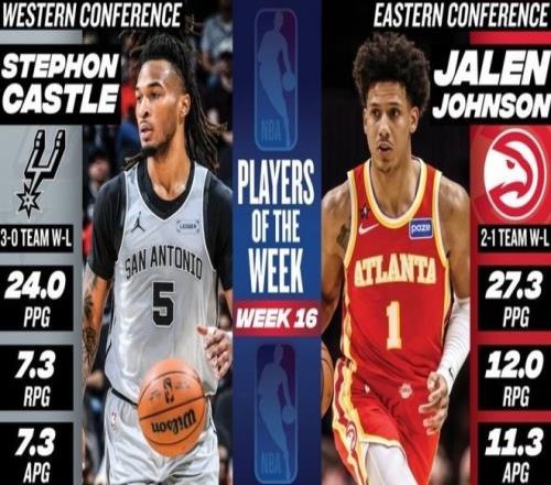 NBA官方公布了第16周的东西部周最佳球员,东部由老鹰前锋杰伦约翰逊当选,西部由马刺后卫卡斯尔当选。杰伦约翰逊上周场均豪取27.3分+12篮板+11.3助攻,带领老鹰取得2胜1负的战绩。据统计,这是杰伦约翰逊本赛季第2次拿到周最佳球员奖。卡斯尔上周场均贡献24分+7.3篮板+7.3助攻,带领马刺队取得3胜0负的战绩。据统计,这是卡斯尔生涯首次获得该奖项。除此之外,猛龙队的巴恩斯、尼克斯队的布伦森和唐斯、76人队的大帝和马克西、骑士队的米切尔、雄鹿队的罗林斯、开拓者队的克林根和格兰特、快船队的小卡、鹈鹕队的墨菲和马刺队的文班亚马等球星获得了周最佳提名。