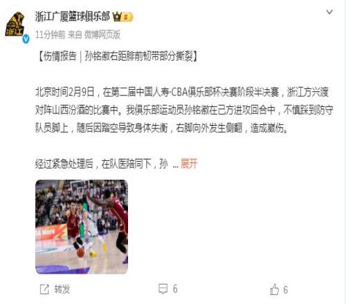 广厦官宣孙铭徽伤情:右距腓前韧带部分撕裂多处损伤伤停68周