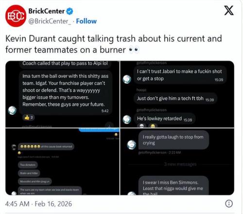 名嘴比尔-西蒙斯也在播客节目上谈到了近期爆出的杜兰特小号事件:“我觉得这事无风不起浪。如果全是真的,而且他在吐槽现在还在并肩打球的队友,那我们可能从没见过这种局面 —— 社交媒体丑闻曝光,实锤他在贬低自己的队友,转头还得跟他们一起打球。”