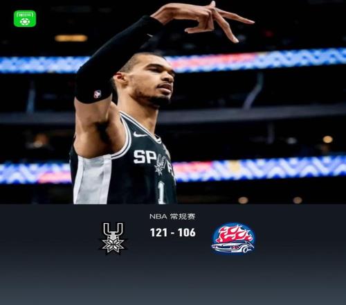 第四节马刺尚帕尼拿下10分,活塞坎宁安拿下9分,最终马刺121-106战胜活塞