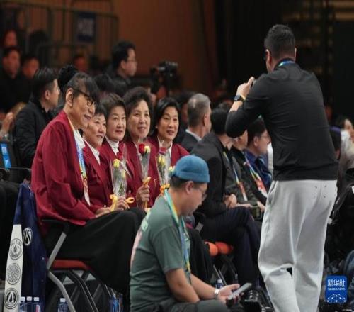 3月7日,在场边观赛的中国篮球名人堂成员郑海霞(左一)等在接受献花后合影。新华社记者 孟永民 摄