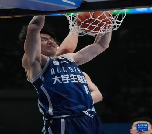 3月7日,大学生联队球员王浩霖(前右)在比赛中扣篮。新华社记者 孟永民 摄