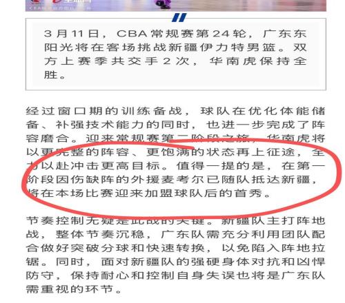 广东宏远的官方推文中直接预告了麦考尔的赛季首秀,表示此前在训练中受伤的麦考尔已经完全康复,可以出战与新疆的比赛。