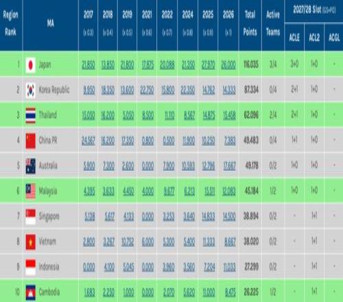 而在中超身后,新加坡联赛(32.753分)和越南联赛(32.106分)也在迫近。本赛季新加坡联赛球队亚战积分比中超多了7.117分,越南联赛球队也比中超多1.284分,新赛季都存在追上中超的可能性。鉴于新加坡、越南联赛参赛球队少,每场胜利增加的亚战积分都比中超多,为本就一胜难求的中超积分压制对手增加了难度。