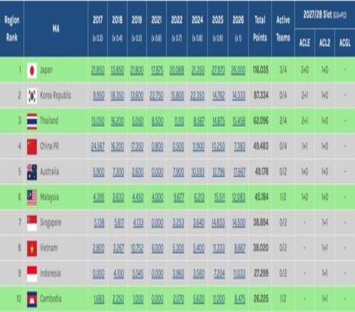 中超本赛季亚冠技术积分滑落至东亚区第10位,被柬埔寨超越