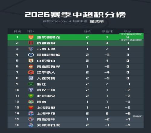 中超实时积分榜:铜梁龙暂登顶,“西南F3”前三,山东首清零