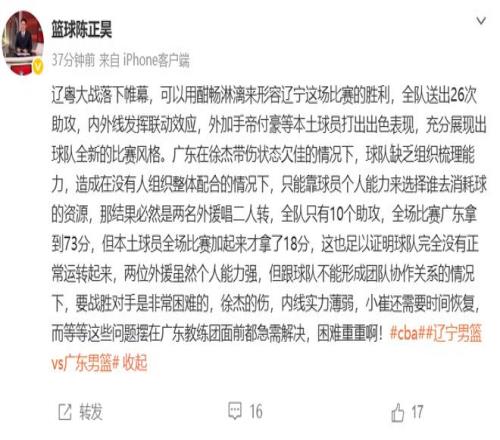 上海的媒体人陈正昊则认为徐杰的问题很大:辽宁全队送出26次助攻,内外线发挥联动效应,外加手帝付豪等本土球员打出出色表现,充分展现出球队全新的比赛风格。