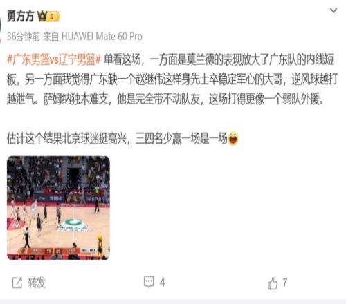 北京媒体人勇方方认为广东缺少了莫兰德和赵继伟这样的内外线核心:单看这场,一方面是莫兰德的表现放大了广东队的内线短板,另一方面我觉得广东缺一个赵继伟这样身先士卒稳定军心的大哥,逆风球越打越泄气。萨姆纳独木难支,他是完全带不动队友,这场打得更像一个弱队外援。