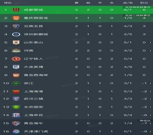 北京时间3月16日,昨天随着成都蓉城1-0青岛海牛,上海海港4-1大胜青岛西海岸,中超第二轮结束了所有比赛,我们看看最新积分榜变动!