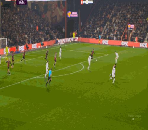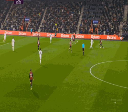 于是在这次转换中,伯恩茅斯击穿曼联的中路,随后从左路送上传中: