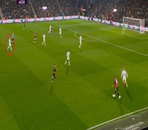 如果布鲁诺一直保持拉扬接球时的站位,他是可以堵住横移线路,从而降低伯恩茅斯进攻效率的: