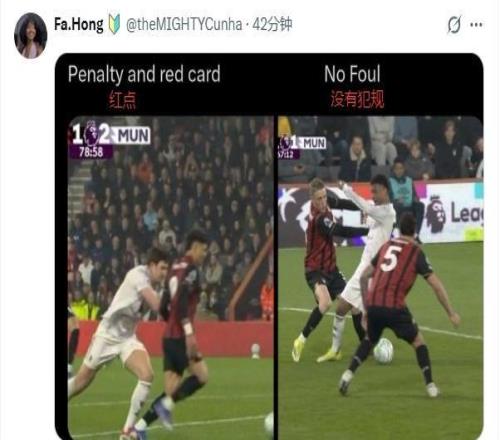 “同样的犯规,一个是红牌+点球,一个啥都没有!”:“光天化日下,曼联被抢劫!”:“应该对主裁处罚,甚至禁赛!”