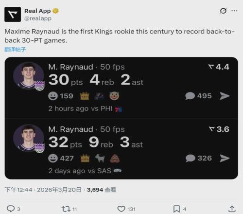 国王新秀马克西姆-雷诺爆发了,过去两场分别砍下30分4板2助1帽和32分9板3助1帽。雷诺成为进入21世纪以来,国王队史第一个连续两场30+的新秀,强如考辛斯都没做到。最新一期的NBA官方新秀榜,雷诺已经升至第四名了。