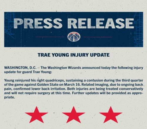 奇才队官方宣布,杨在周一对阵金州勇士的比赛第三节中右股四头肌再次受伤,出现挫伤。队记罗宾斯透露,因持续背痛进行的影像学检查,同时确认他存在下背部刺激症状。奇才队补充道,两处伤病目前均采用保守治疗,现阶段无需手术。美媒报道称,考虑到奇才的摆烂以及常规赛余下时间不多,特雷-杨基本赛季报销。
