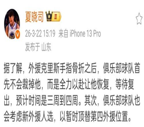 山东男篮本赛季的目标是冲击前八,赛季初期他表现不佳,但随后开始提升,并且保持在前四的位置,然而现在他们迎来了困难,根据山东媒体报道,克里斯由于手部出现了骨折情况,需要至少休息4周时间,常规赛基本确定报销,球队方面考虑寻找新的外援来进行补充。