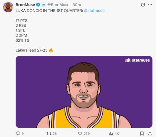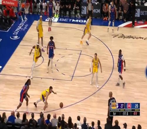 首节东契奇居然为了球权飞扑到场外,也是这次飞扑导致他的腿部不适下场处理,但他首节11中5+三分7中2拿到17分2篮板1抢断,他一人支撑了湖人的进攻,湖人全队首节只拿27分而已。