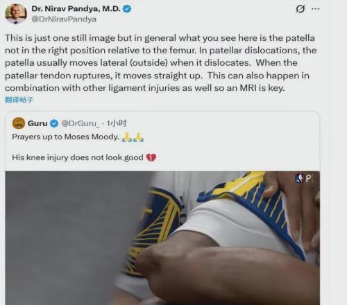 伤病专家Nirav Pandya对此表示:“穆迪有可能髌腱断裂、髌骨脱位,以及多条韧带损伤等等。”