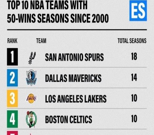 新世纪后50胜赛季数:马刺18次领跑,独行侠第2,湖绿火骑第3