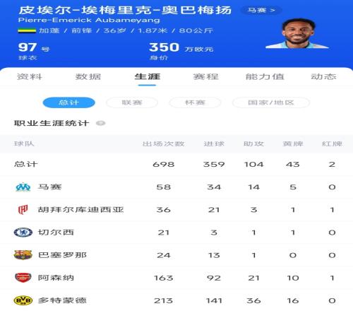 宝刀不老!36岁奥巴梅扬新赛季9场8球2助,巅峰身价曾达7500万欧